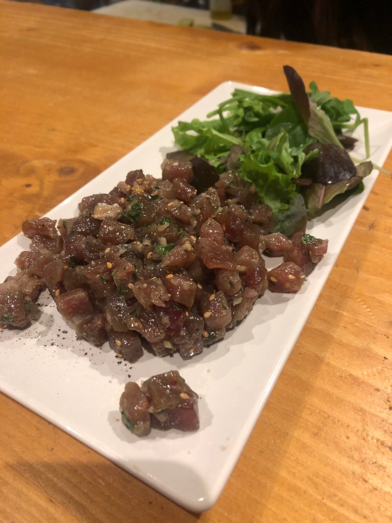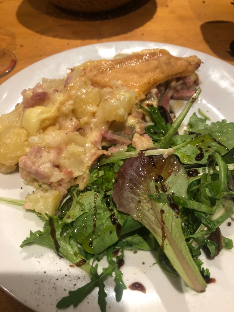 We stopped by Perpignan on the way to Spain where James got to climb at La Grappa Escalade, and we had a memorable lunch at L’Emile, a tiny hole in the wall restaurant in the old town area of Perpignan. It had some high tables and bar stools outside and a lot of happy people, eating and drinking. Inside was a small bar counter, where we sat. We love watching all the action in a kitchen, so lunch was a leisurely 2.5 hour affair that involved 3 courses and 3 glasses of wine each. We left feeling stuffed of tuna carpaccio, croquettas, tartiflette and more cheese.