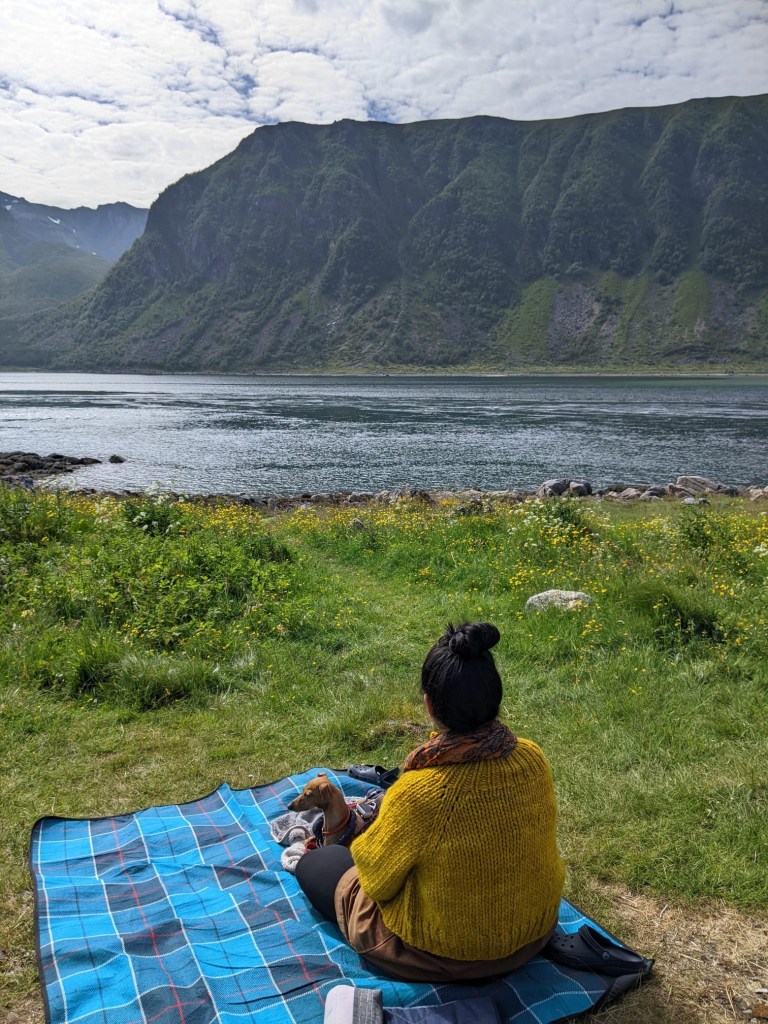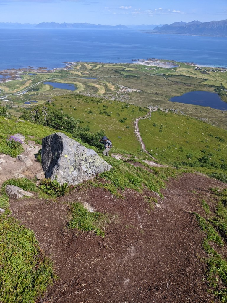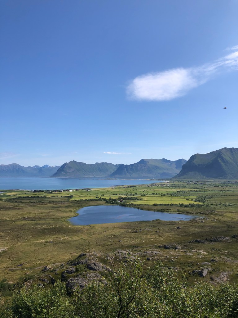 The steep climb up was made torturous by the swarms of flies. But the views at the top were more than rewarding. Hoven is surrounded by the sea on one side, and flat marshy (fly-ridden!) land flanked by mountain peaks on the other. We felt higher up than the 358m height of Hoven. The mountains in the Lofotens aren’t actually that high – the highest is Møysalen at 1,262m. What makes them particularly striking though is how steep they are, rising up to very pointy peaks and ridges, and also how densely they sit on the relatively small Lofoten Islands.This makes the islands look otherworldly, or just plain magical.