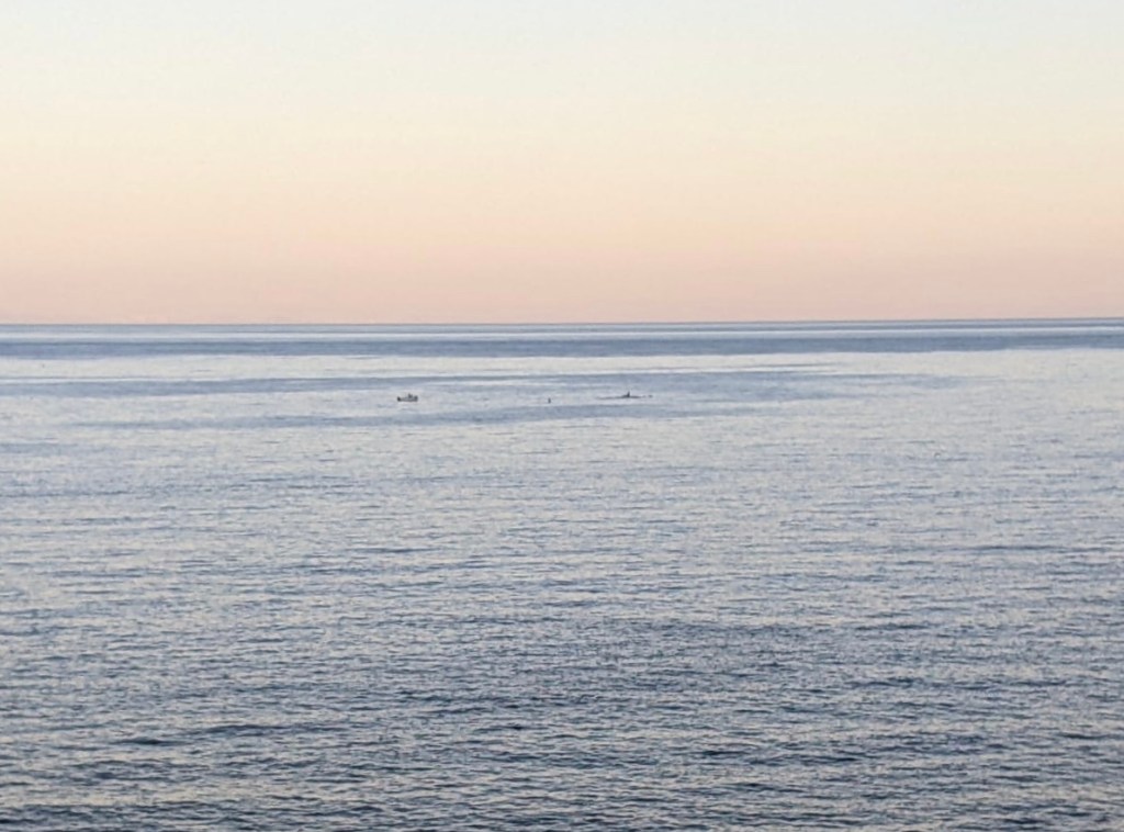 The best thing about the campsite is that we spotted orca’s there! Aileen spotted the dorsal fins of several whales first while sitting in the campervan, then worried momentarily that James, who had gone to wash dishes, would not see them. Thankfully he returned to the van, and we ran to and climbed up a big rock for a better vantage point. We saw different sized fins, plumes of water, and their tails as they slowly made their way past the campsite. Our conclusion from the number, behaviour and some internet research was these were orca’s herding their prey. To the naked eye it was all incredibly clear and exciting, we have some very blurry photos (that could be anything) to confirm 😉