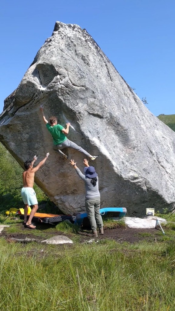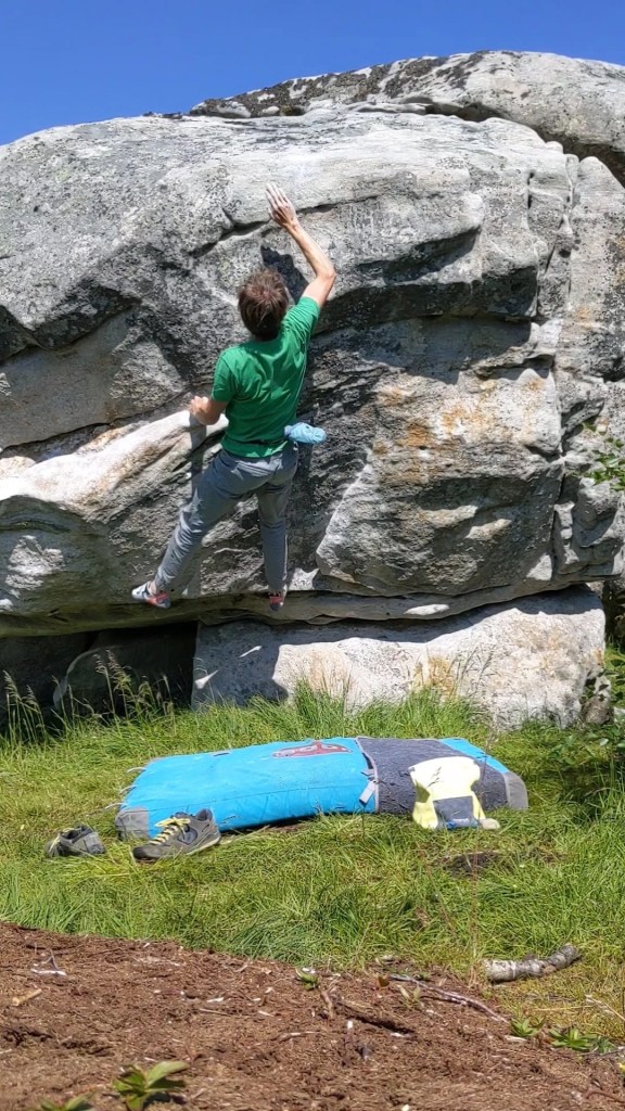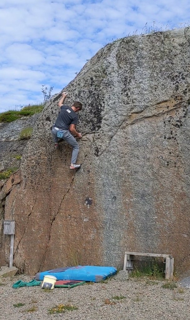 - King Fisher V6 at Trolldalstjønna. It is a steeply overhanging arete and has a very scenic backdrop. James was happy to flash. It is a nice climb, but ultimately he doesn’t think it will be memorable.