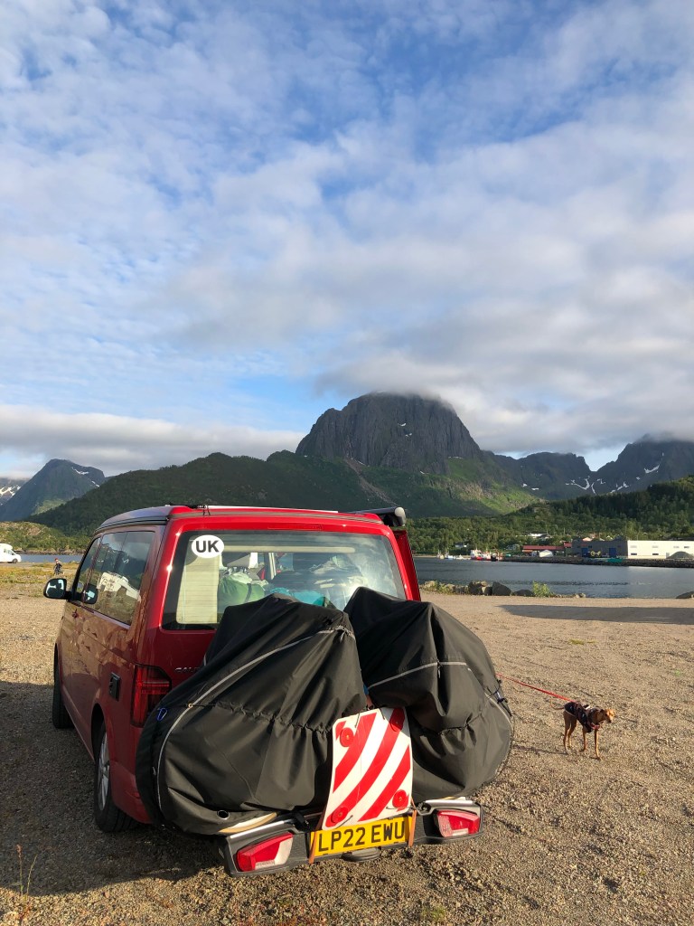 Once in Norway we continued west on the E10 toward the Lofoten Islands. We stopped twice, once for a bad coffee, and another time to feed Zeus, make a proper coffee and decide to continue driving to get to the Lofotens. This was a good choice, the scenery was amazing and we finished the day’s journey at a wild camping spot at a harbour in Fiskebøl, on the northern coast of Austvågøy, the northernmost of Lofoten’s Islands.