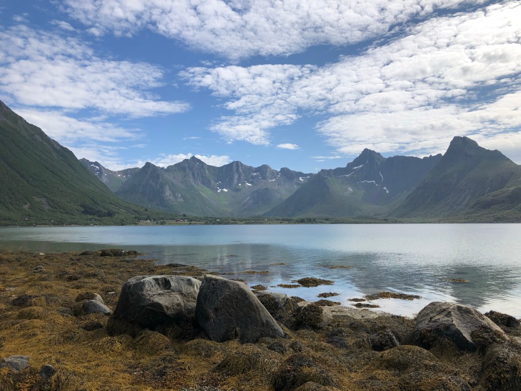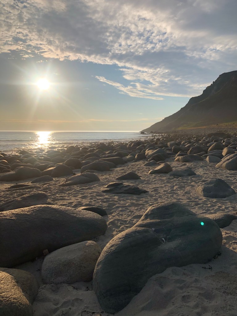 The following day we decided to do a relaxing hike along the coast directly from the parking. It turned out not to be so relaxing. We’d forgotten for a moment that mountains are steep in the Lofotens, so the coastal walk went up and down some steep paths and over slippery boulder fields. The views were amazing though, particularly looking back at tiny Unstad nestled in a valley surrounded by soaring peaks.